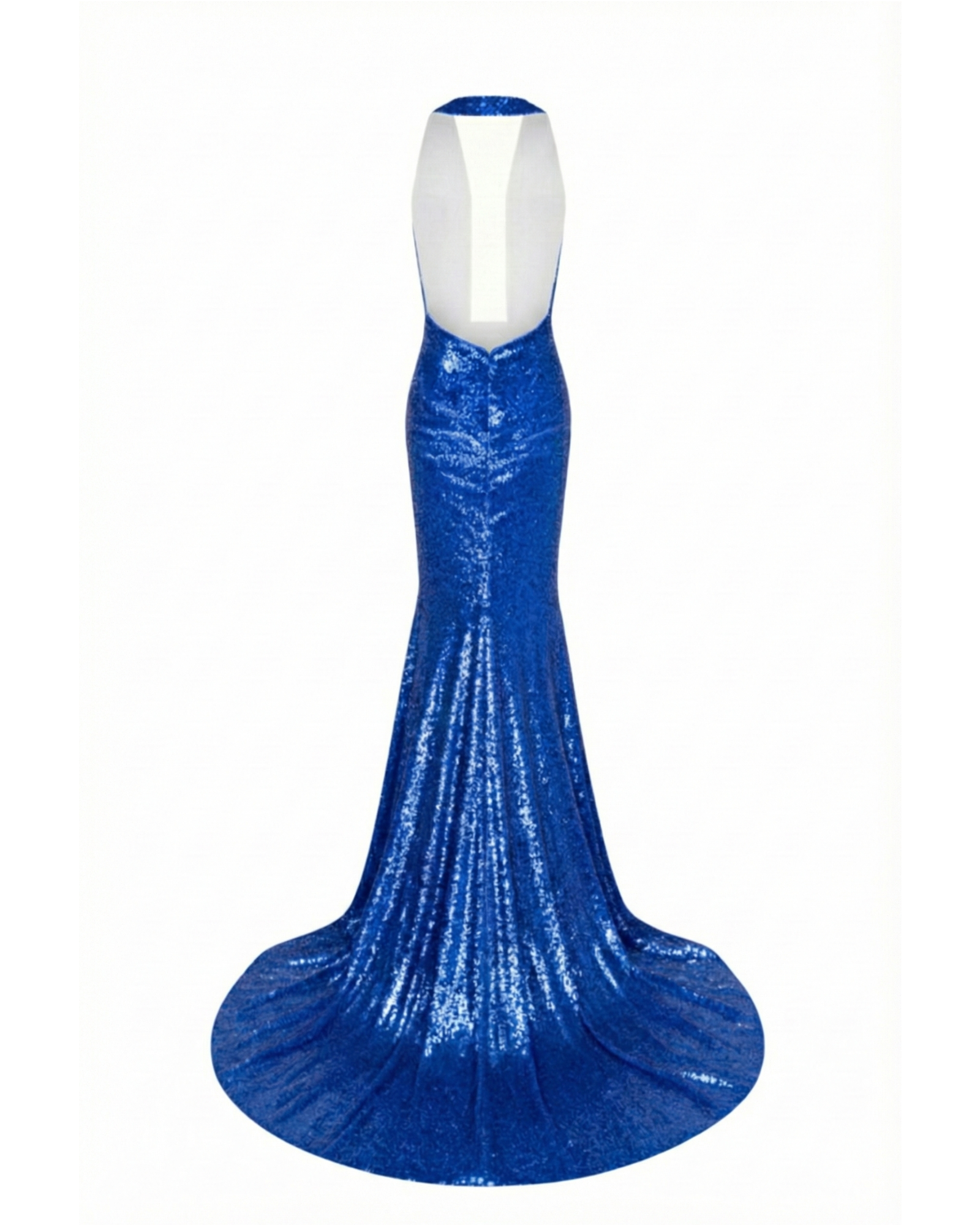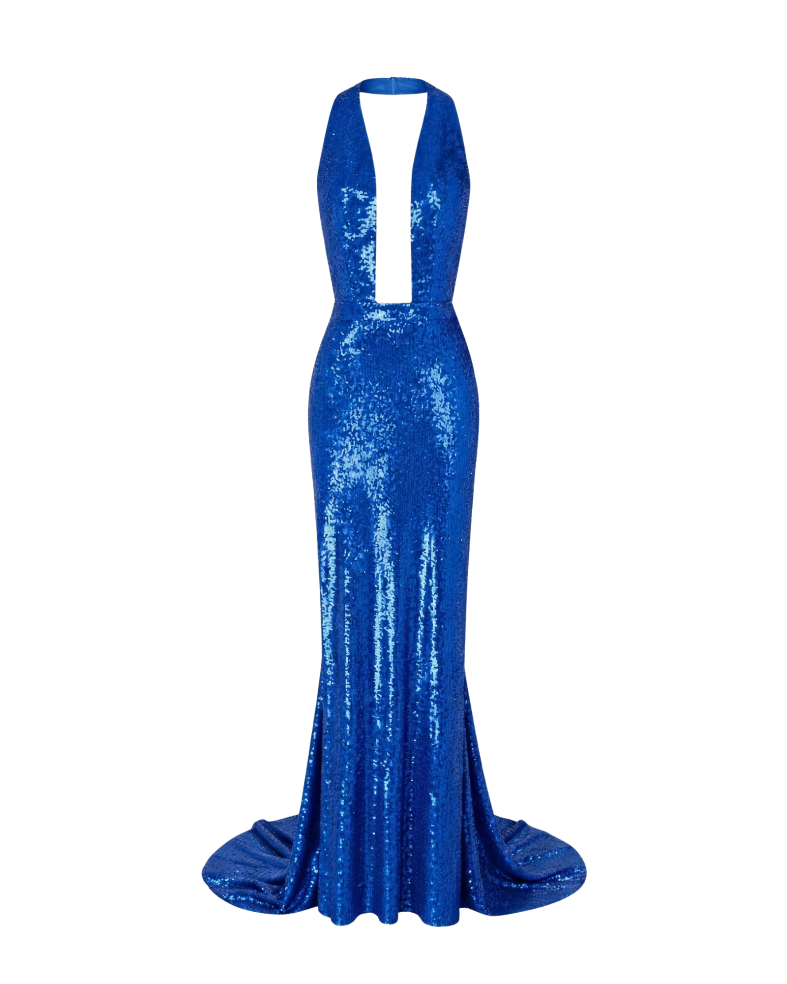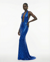 BACKLESS SEQUIN GOWN WITH TRAIN IN COBALT BLUE