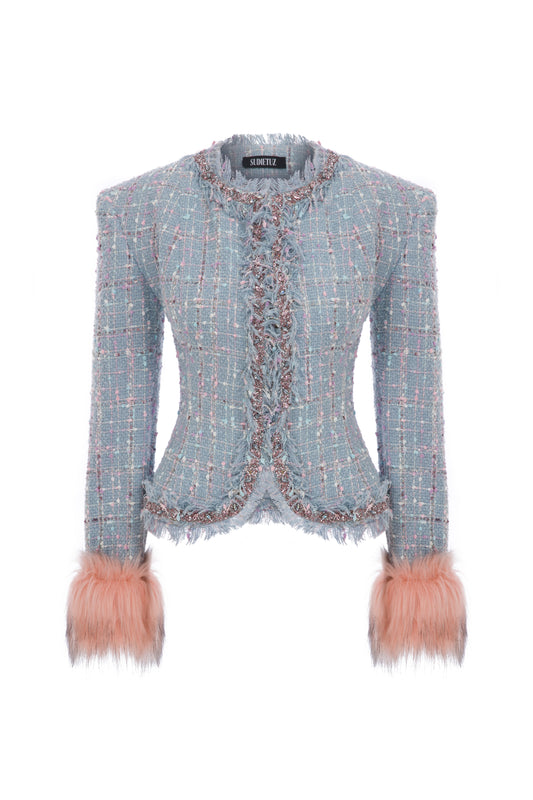 TWEED JACKET WITH RHINESTONE AND FAUX FUR TRIMMINGS