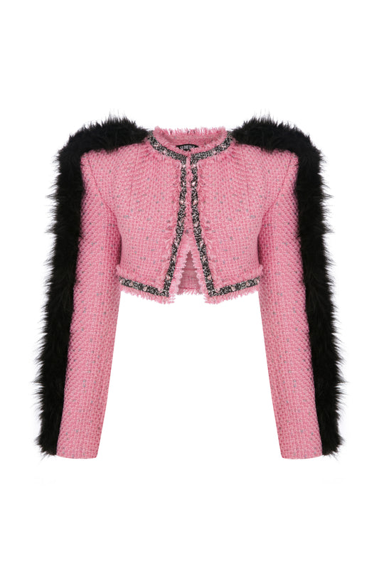 CROPPED TWEED JACKET WITH RHINESTONE AND FAUX FUR TRIMMINGS