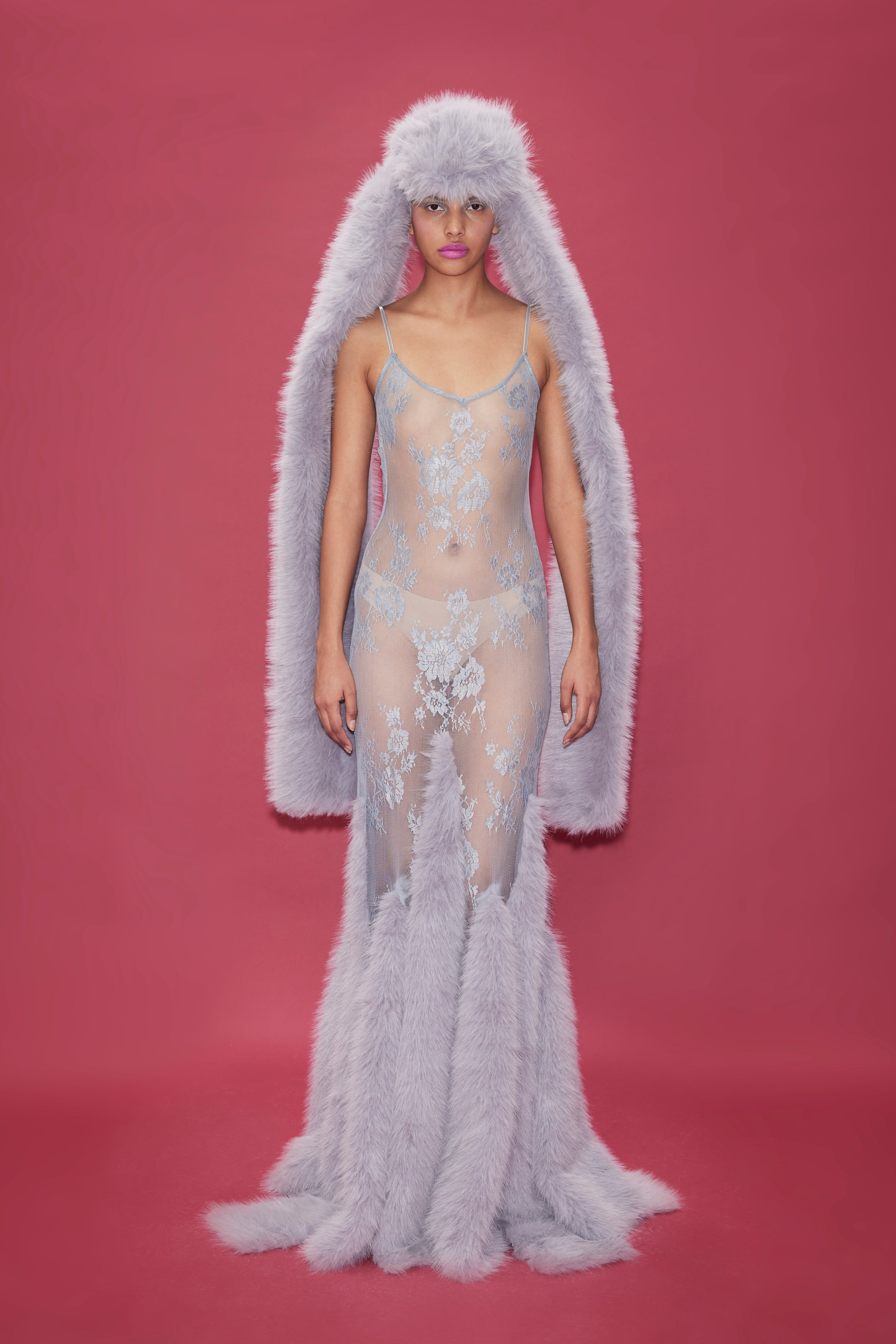 LACE MAXI DRESS WITH FAUX FUR TRIMMINGS