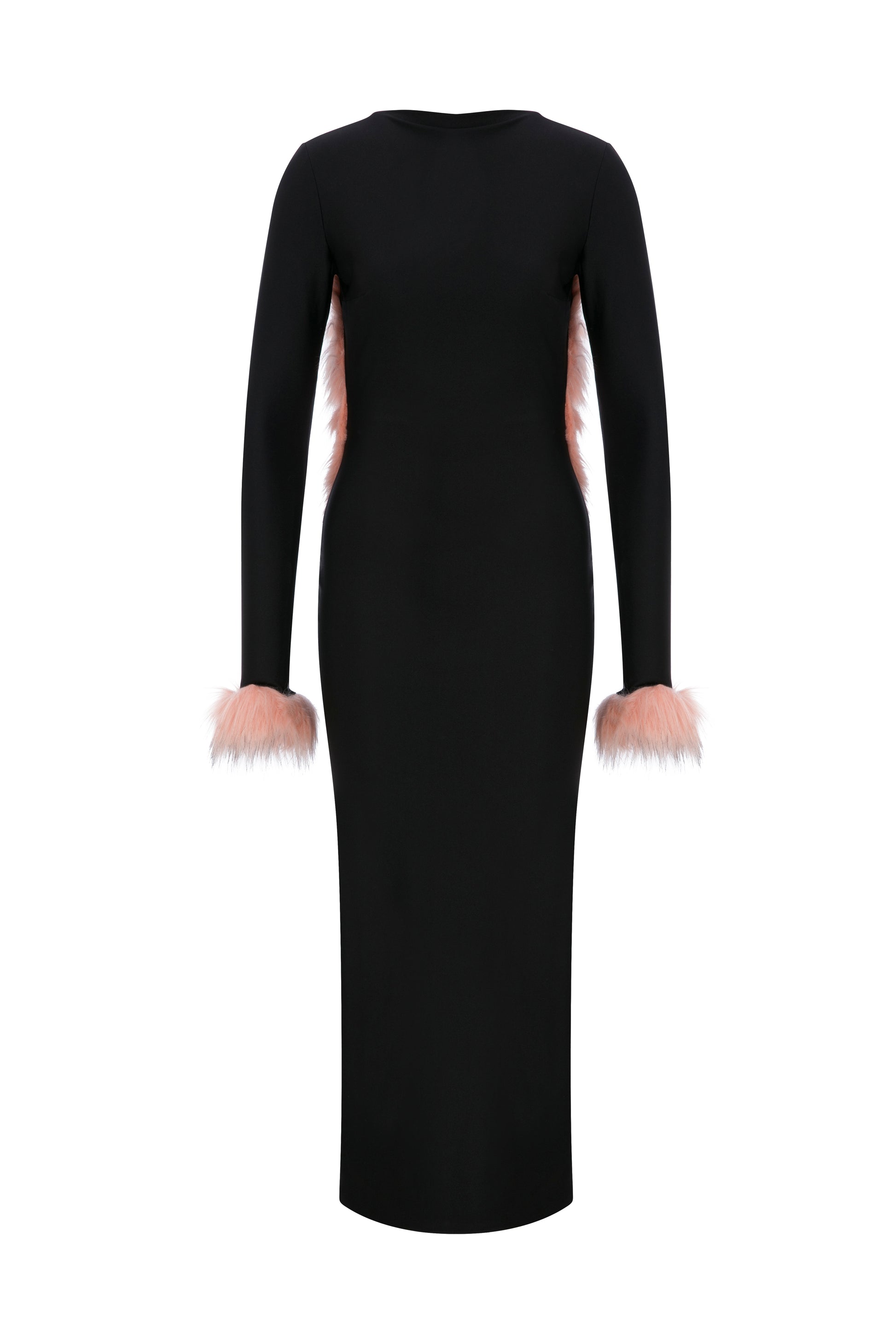 JERSEY MIDI BACKLESS DRESS WITH FAUX FUR TRIMMINGS