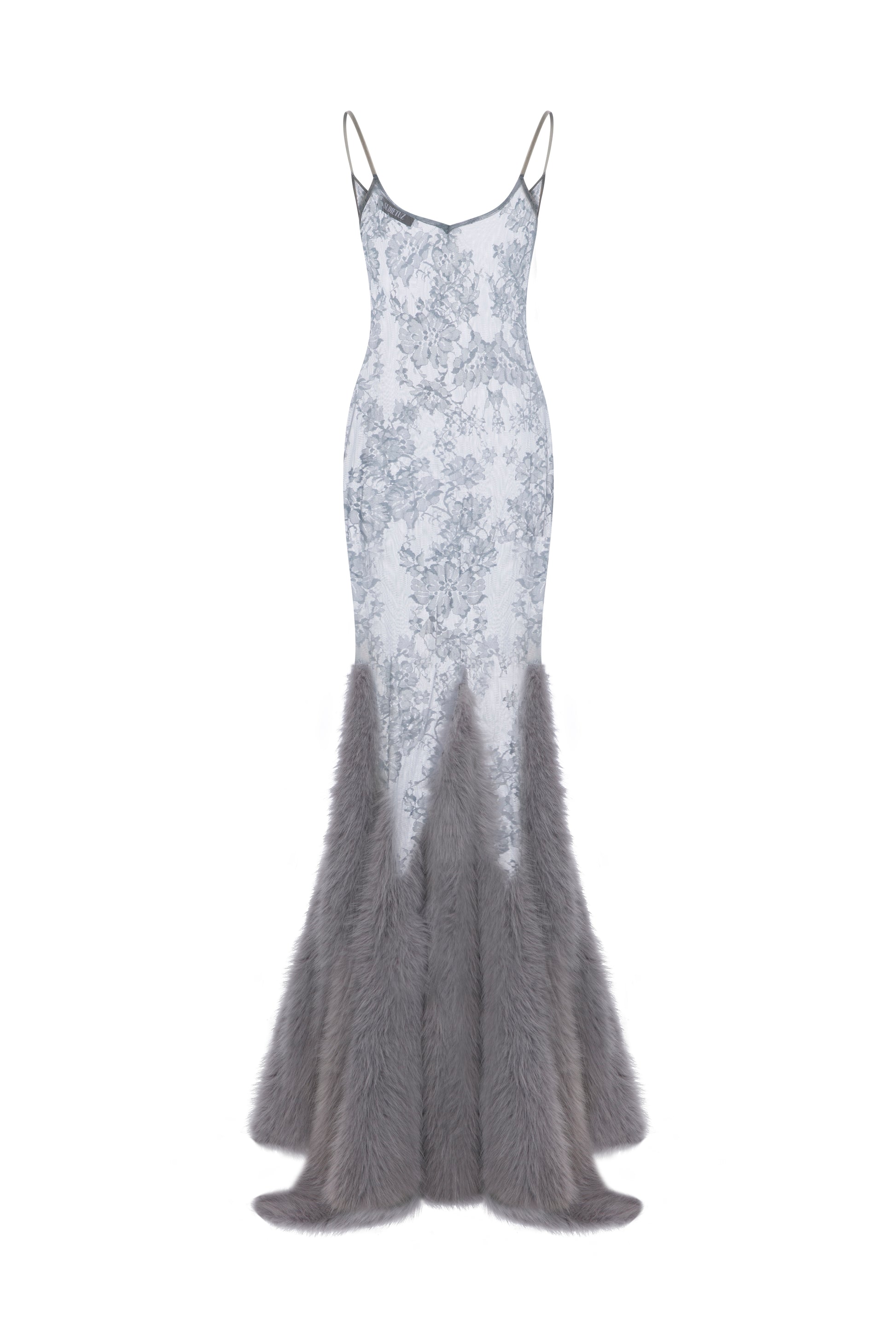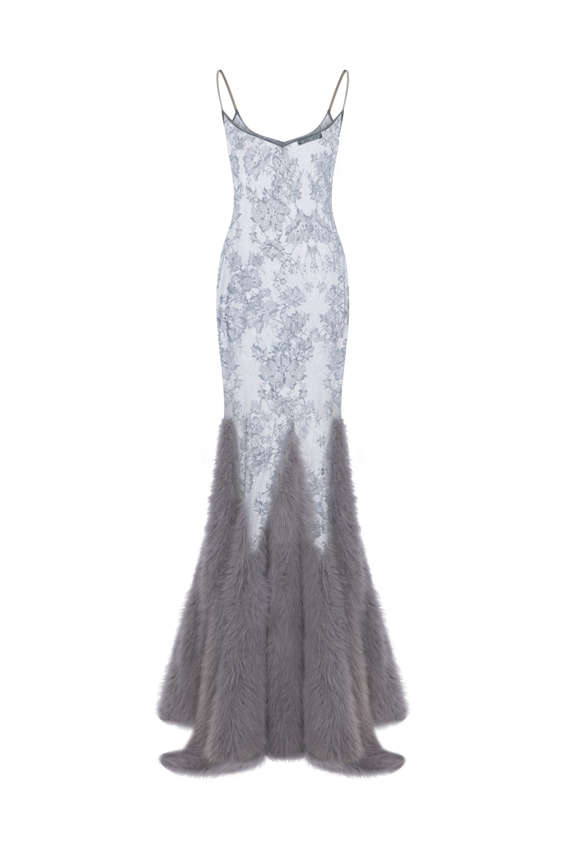 LACE MAXI DRESS WITH FAUX FUR TRIMMINGS